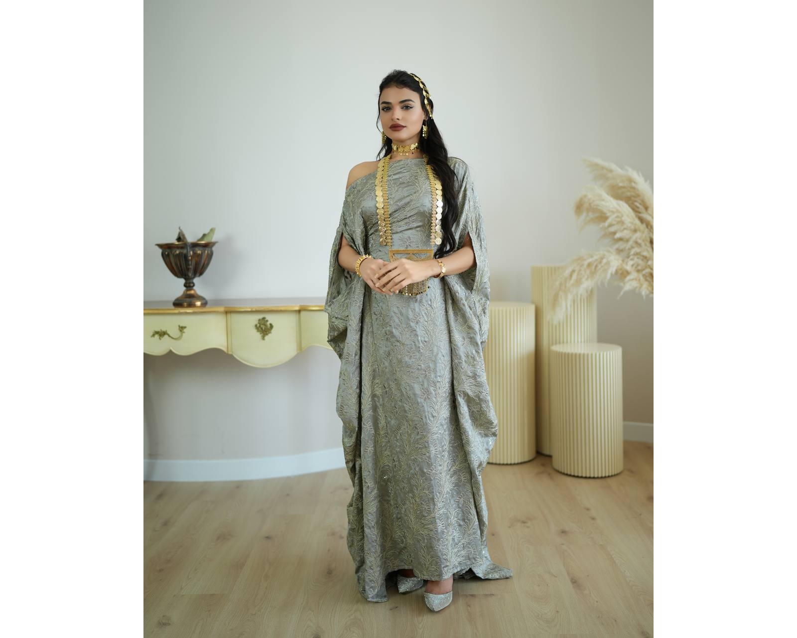 The dress is free size with an internal belt for tightening. The measurement is taken according to the required length.